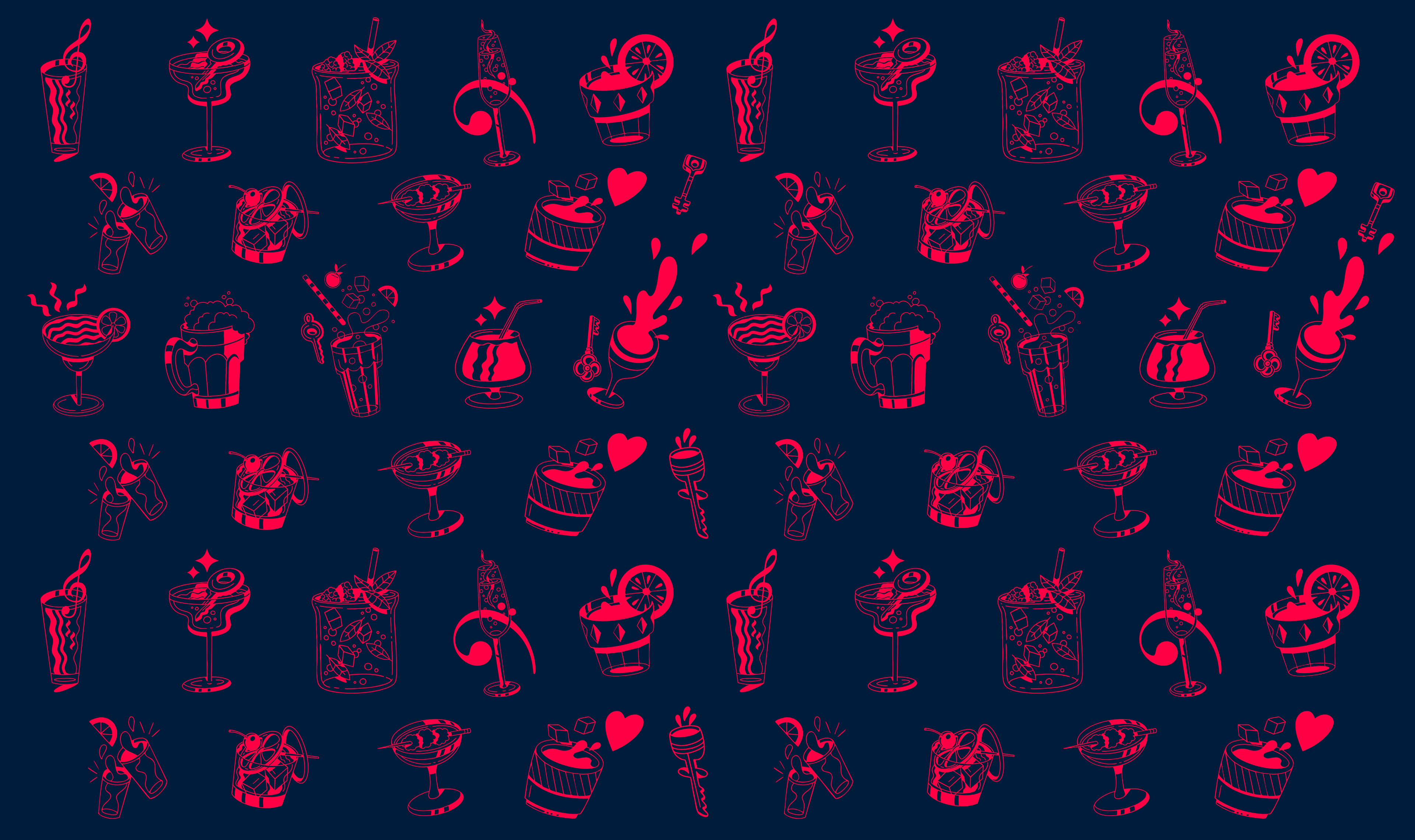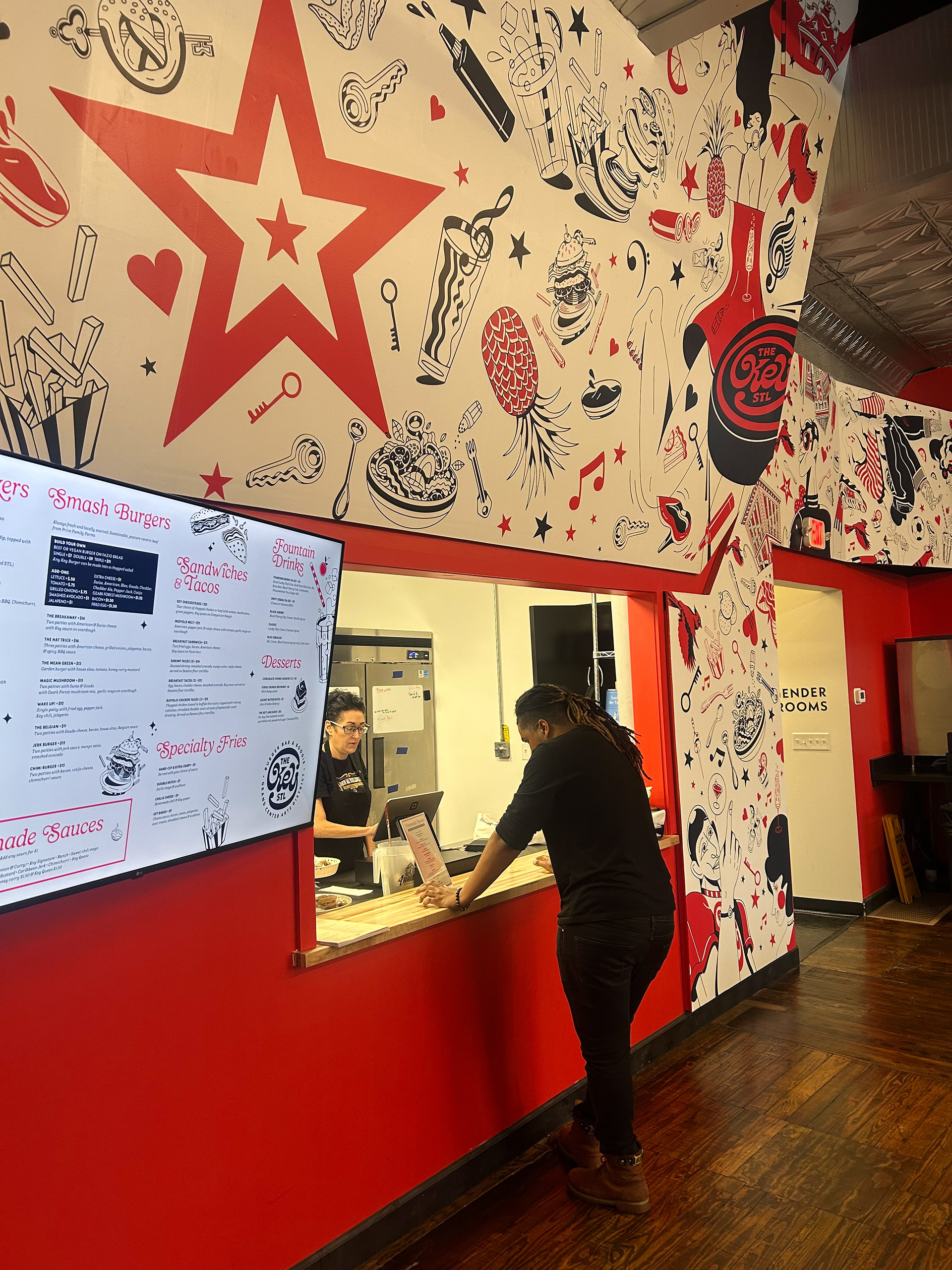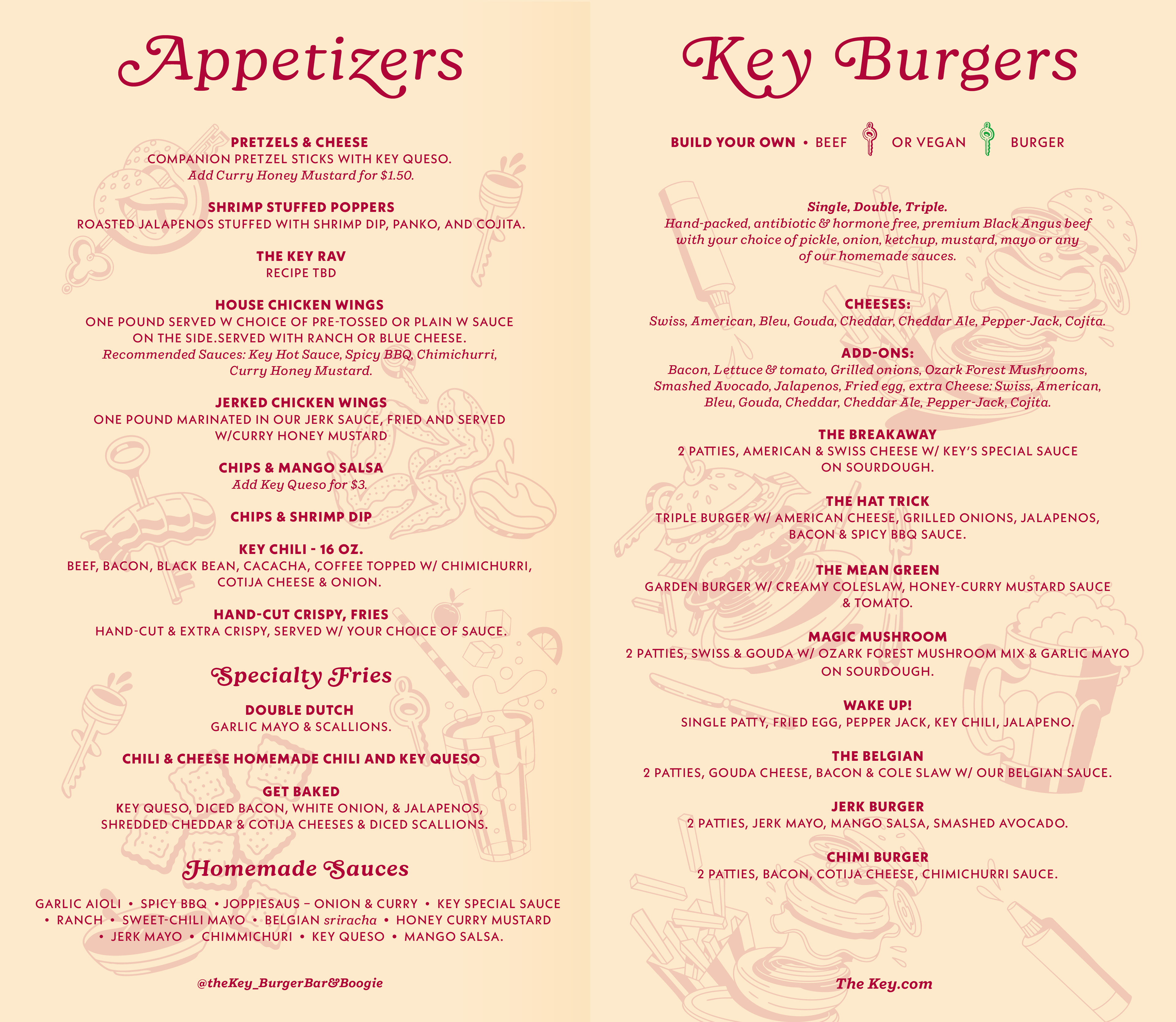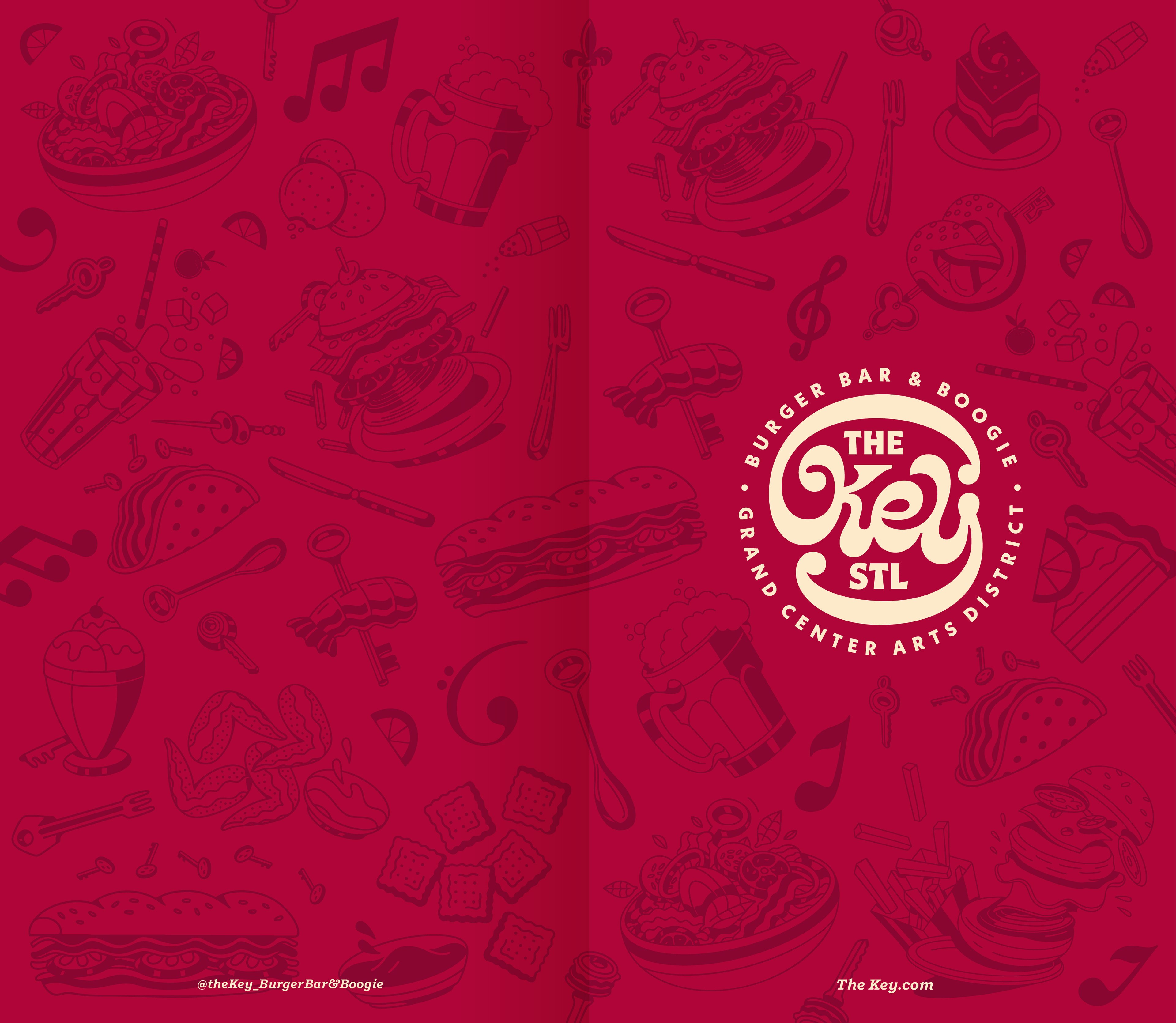 Visual tone design and illustrations for The Key, a space specializing in gourmet burgers and sauces, and featuring live music. An inclusive, distinctive venue designed for all audiences.